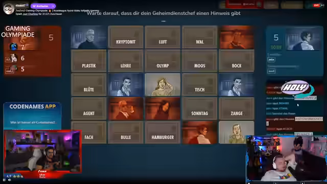 03:23:12Nach den intensiven 'Fall Guys'-Runden wechselt das Team zum Spiel 'Codenames'. Es wird eine neue Erklärung der Regeln gegeben, bei der ein Team Hinweise für das andere Team gibt. Der Streamer übernimmt die Rolle des Erklärenden. Er lobt einen Mitspieler dafür, 'smart' Hinweise zu geben, und spricht von einer 'super Synergy' im Team. Die Runde verläuft erfolgreich, was zu großer Freude und Lobeshymnen unter den Teilnehmern führt.