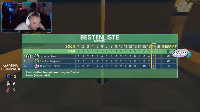 04:40:57Nach der 'Wer wird Millionär'-Runde wechselt der Stream zum Spiel 'Golf It'. Die Streamer bilden Teams und wetteifern in verschiedenen Levels. Der Fokus liegt auf der Koordination und der Physik des Spiels, insbesondere bei Putts über Wasser oder mit Banden. Die Spieler geben sich gegenseitig Tipps und reagieren emotional auf gelungene oder gescheiterte Versuche. Es werden Hitzediskussionen über Taktiken geführt.