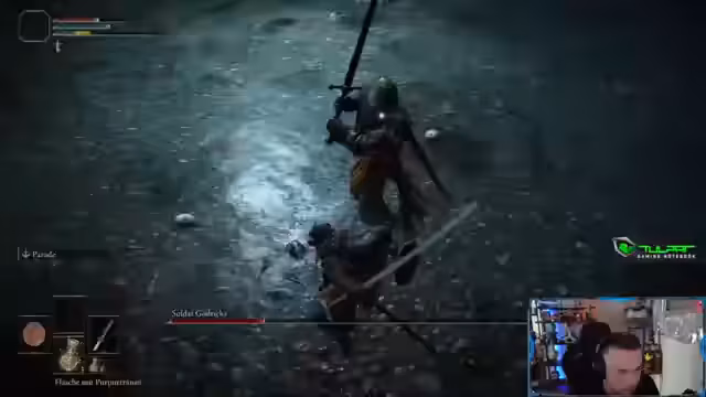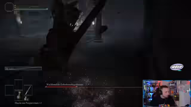 02:39:47Der Streamer ist im Spiel aktiv, kämpft gegen einen Boss und macht sich dabei Gedanken über die Steuerung. Ein Hauptthema ist die Umstellung von der Maus auf einen Controller, da er Schwierigkeiten hat, das Input-Gerät zu konfigurieren. Des Weiteren werden die Spielmechaniken wie das Aufladen von Angriffen (L2), die Funktion von Talismanen und die Konsequenzen eines Todes (Neustart vom Bossraum) diskutiert. Der Streamer berichtet über den ersten Kontakt mit neuen Gegnern wie der 'Feuermusch' und den 'Steingräber-Troll', welche als besondere Herausforderungen beschrieben werden.