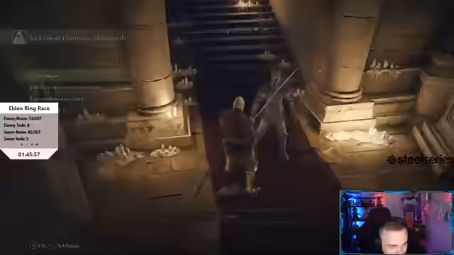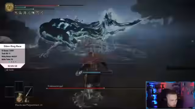 08:45:07Der Stream startet mit einem Boss-Race gegen andere Streamer wie Mats und Weipass. Die Konkurrenz ist intensiv, und der Streamer kämpft mit der Erwartungshaltung, immer schneller zu sein. Die technische Stabilität des Spiels wird kritisiert, da das Game oft zu Rucklern und Problemen führt, was die Frustration über die Bosskämpfe verstärkt, insbesondere bei Gegnern wie der Scharlachfeule und den Todesritenvögeln, die als unnötig recycelt empfunden werden.