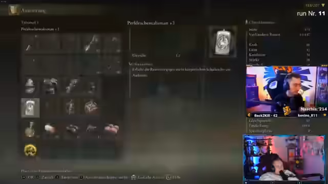 08:10:37Im weiteren Verlauf des Streams wird die Suche nach Ausrüstung und Items vorangetrieben. Der Streamer kämpft gegen einen starken Gegner, der sich selbst heilt, was ihm erhebliche Schwierigkeiten bereitet. Nach einem erfolgreichen Kampf findet er eine Rüstung, die er als 'eine der besten im Spiel' beschreibt. Er wechselt zur mittleren Belastung, um eine 'Fat Roll' zu vermeiden, und stellt seine Ausrüstung neu ein. Gleichzeitig bespricht er den Bosskampf als Teil seiner Route, den er in seinem speziellen Run durchführen möchte.