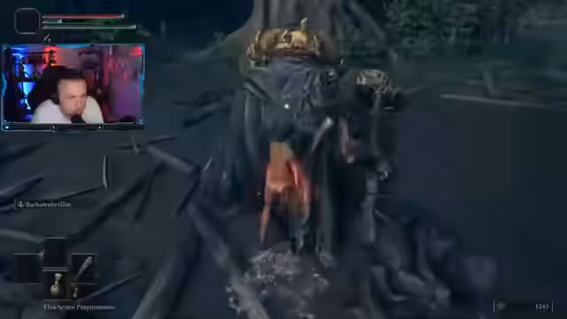 08:43:11Der Streamer plant einen Kampf gegen einen Drachen und sammelt dafür Ressourcen wie einen goldenen Krähenfuß, um mehr Seelen zu erhalten. Für den Kampf benötigt er eine Blutungswaffe, trifft jedoch auf das Problem, dass seine aktuelle Waffe (eine Schere) wenig Schaden anrichtet und nicht effektiv genutzt werden kann, da sie nicht gelevelt ist.