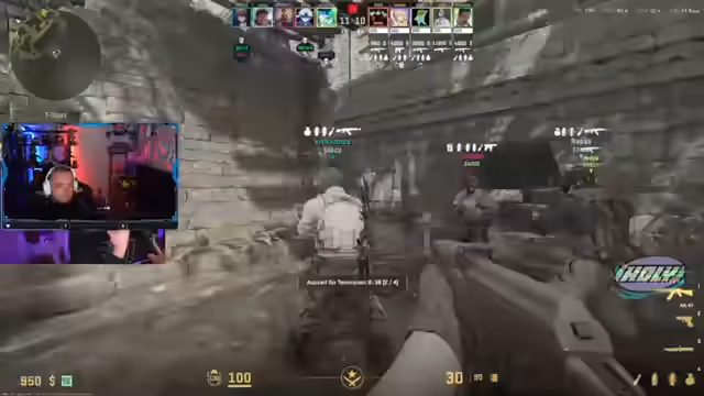 09:35:50Ein koordinierter B-Rush wird eingeleitet, der jedoch von Gegnern erwartet wird und starken Widerstand erfährt. Die Verteidiger kontern mit gezielten Flashbangs, Molotovs und Präzisionsschüssen. Mehrere Teammitglieder wie Edi und Danny werden schnell eliminiert. Nach dem erfolgreichen Konter der Gegner zwingt die Niederlage das Team in eine aussichtslose Situation. Ein spielerischer Fehler wird als Hauptgrund für den Verlust der Runde und damit des Spiels identifiziert.