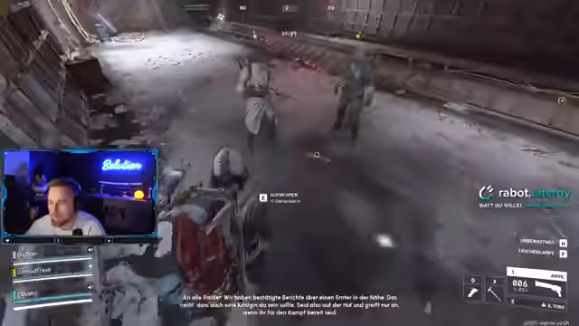 00:07:32Im Fokus des Streams steht das Spiel Arc Raiders. Der Streamer beschreibt seine aktuelle Situation im Spiel als "obdachlos", was bedeutet, dass er keine gute Ausrüstung besitzt. Er berichtet von frustrierenden PvP-Erfahrungen, in denen er von anderen Spielern getötet wird und seinen gesamten Loot verliert. Eine Szene beschreibt, wie er von einem anderen Spieler in einen Hinterhalt gelockt und eliminiert wird, was ihn wütend macht.