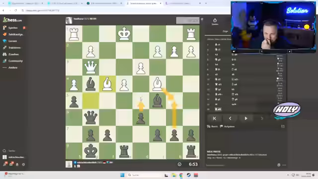 01:44:03Nachdem die Themen rund um den Patch durchgegangen wurden, wechselt der Streamer zu einem anderen Segment. Er spielt eine Schachpartie gegen einen Chat-Mitglied namens Tilo bei etwa 900 Elo und gewinnt mit einer strategischen Spielweise, die er als 'exzellent' bezeichnet. Später gibt es Ankündigungen für den Abend, einschließlich eines_DFBE-Pokal-Watchpartys mit Casey, bei dem sie ein kleines FIFA-Team spielen. Der Streamer zeigt sich begeistert von den HSV-Chancen und äußert die These, dass Gegner nach einem Trash-talk mit 70% Wahrscheinlichkeit besser spielen würden.