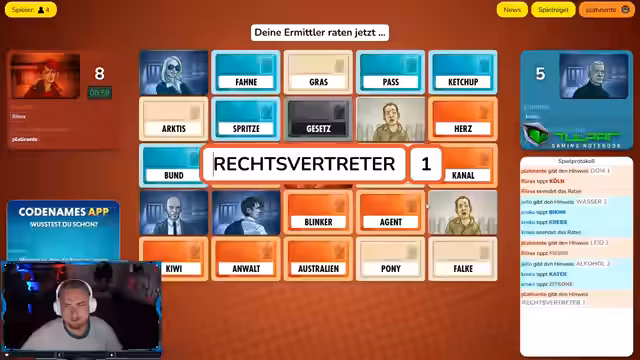 02:52:52Eine intensive Runde des Spiels Codenames beginnt. Das Team versucht, Begriffe wie 'Fußball', 'Stärke' und 'Blech' zu erraten, wobei Zeitdruck und falsche Wortverbindungen zu Frustration führen. Der Streamer muss schnell Begriffe wie 'Nudeln' und 'Honig' platzieren und erkennt, dass einige der gesuchten Worte wie 'Hawaii' oder 'Rahmen' nicht passen. Trotzdem wird nach mehreren Runden das Spiel gewonnen.