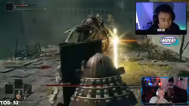 03:34:08Der Streamer konzentriert sich nun wieder auf Elden Ring, besonders auf den Kampf gegen Margit. Er beschreibt die Schwierigkeiten, den richtigen Zeitpunkt zum Angriff mit dem Hammer zu finden, und kritisiert die fehlenden Drops. Der Streamer ist frustriert über die vielen Tode und die fehlenden Drops. Er wünscht sich mehr mentales Verfall bei Casey und plant, ihn nach dem Stream zu Godric zu schicken.