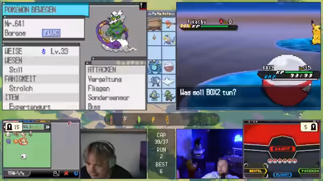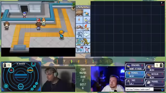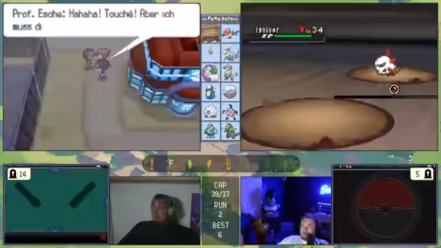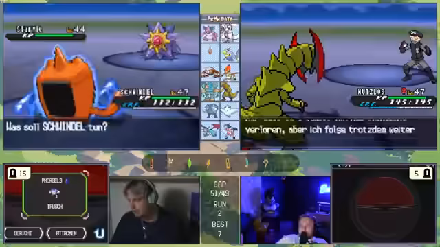 00:15:21Während des Runs treten erste Herausforderungen auf. Das Opfer-Pokémon stirbt, was den Verlust eines potenziell starken Links bedeutet. Der Streamer überlegt, ob der Einsatz eines Meisterballs für das gefangene Rotom gerechtfertigt ist, und diskutiert die Vor- und Nachteile verschiedener Pokémon und ihrer Fähigkeiten. Das Thema "männliche Pokémon" wird aufgegriffen, da einige gefangene Pokémon als weniger maskulin angesehen werden.