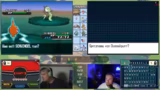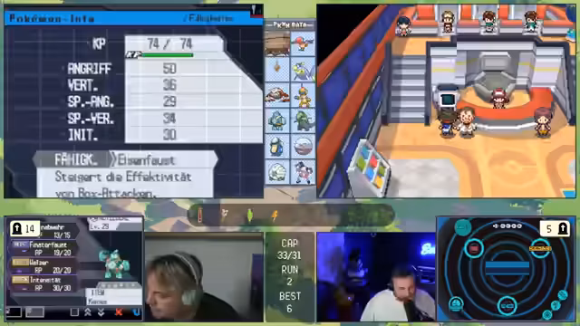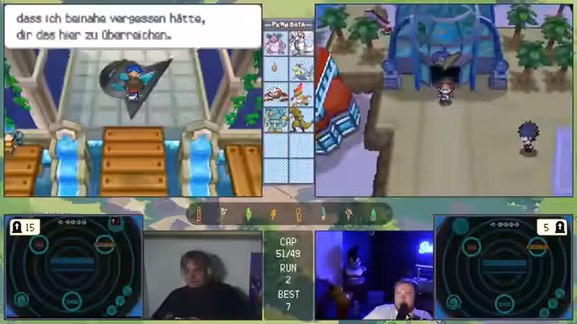 07:29:00Nach einem Kampf muss der Streamer ratlos ein Passwort eingeben, um weiterzukommen. Der erste Buchstabe des Passwortes wird als 'R' identifiziert und es scheint etwas mit Drachen zu zu tun haben. Da das Team an Kraft verloren hat, wird eine kurze Pause eingelegt, um die Pokémon im Pokémon-Center heilen zu lassen.
