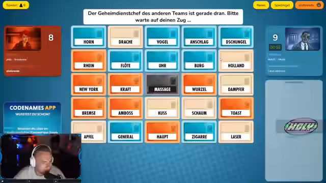09:03:28Es wird analysiert, warum bestimmte Hinweise nicht funktioniert haben und wie man in Zukunft besser vorgehen kann. Die Gruppe diskutiert über die Verbindung zwischen 'Krieg', 'New York' und 'Amboss', sowie über die Bedeutung von 'Holz' und 'Wurzel'. Es wird versucht, die Denkweise des Gegners zu verstehen und die eigenen Strategien entsprechend anzupassen. Es wird überlegt, ob man 'Soldat' als Hinweis verwenden soll, obwohl dies als riskant angesehen wird. Die Gruppe diskutiert über mögliche Verbindungen zwischen 'Tee', 'Genie', 'Puppe', 'Herbst' und 'Strom', wobei 'Atlas' ebenfalls in Betracht gezogen wird. Es wird versucht, die Hinweise des Gegners zu entschlüsseln und die richtigen Schlüsse daraus zu ziehen. Es wird überlegt, ob man 'Bock' und 'Mandel' als Hinweise verwenden soll, wobei die Verbindung zu 'Tier' und 'Futter' im Vordergrund steht. Die Gruppe versucht, die bestmöglichen Züge zu machen und die Runde zu gewinnen.