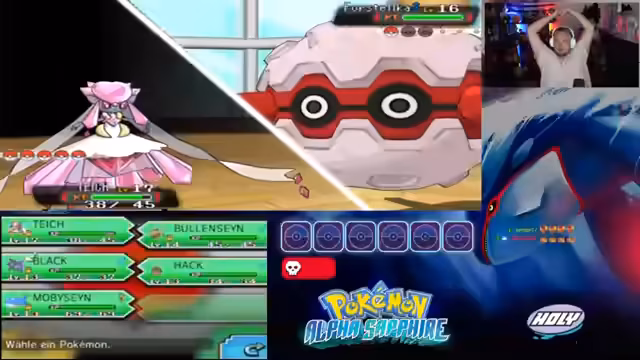 10:40:19Der Kampf gegen einen Arena-Leiter mit Mega-Entwicklung erweist sich als extrem riskant, da das eigene Team stark geschwächt ist und kaum noch Ressourcen wie Heiltränke zur Verfügung stehen. Durch präzises Managen von Statuswerten und dem Einsatz von Erdbeben kann jedoch ein wichtiges gegnerisches Pokémon besiegt werden. Die Anspannung ist hoch, da ein Reset droht, falls die verbleibenden Gegner nicht kontrolliert werden können, aber letztlich kann der Sieg durch taktisches Vorgehen und etwas Glück gesichert werden.