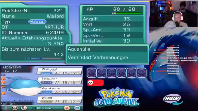 00:56:03Bevor der Run beginnt, treten massive technische Schwierigkeiten auf. Der Streamer kann den Speicherstand auf seinem DS nicht löschen, was den Start verzögert. Nach zahlreichen Versuchen und Hilfe vom Chat kann das Problem schließlich gelöst werden. Der eigentliche Run beginnt schließlich erfolgreich in Alpha Saphir, der Starter wird ausgewählt und der erste Kampf gegen einen wilden Geist-Pokémon initiiert.