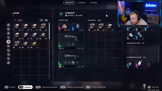 03:03:20Der Streamer spielt eine Runde in einem Extraction-Shooter und optimiert sein Vorgehen. Er diskutiert den Einsatz von 'Energy-Muni' (herstellbar aus Akkus) und erwähnt seltene Blueprints wie den Equalizer, der durch Events gewonnen wird. Trotz eines vollgestopften Inventars verliert er die Runde frühzeitig und kritisiert die hohen Kosten für Heilitems. Er analysiert seine Route auf der Karte und bezeichnet den Bereich um das Rathaus als hochriskant. Später findet er einen sicheren Raum zum Extrahieren und nimmt wertvolle Gegenstände wie einen Luken-Key mit.