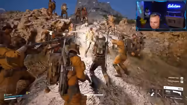04:17:29Der Streamer kündigt ein großes Community-Event an und bittet die Zuschauer um Teilnahme. Das Ziel ist es, mit einer Gruppe von acht bis zehn Spielern, den sogenannten 'Erpeln', gemeinsam in das Spiel einzusteigen. Das Event ist als 'Cyberbombing' konzipiert, bei dem alle Teilnehmer mit schwerer Munition ausgerüstet sind und sich am Bergkamm treffen, um den Erpel-Alpha den gesamten Loot zu übergeben.