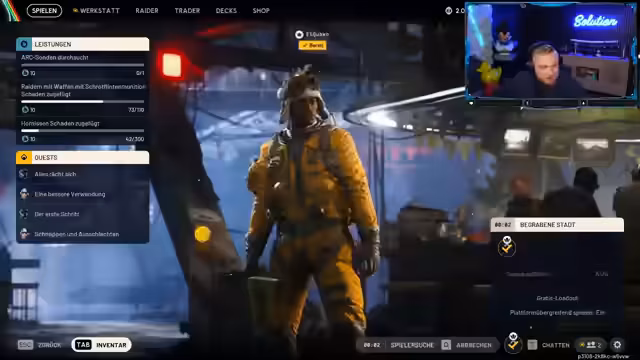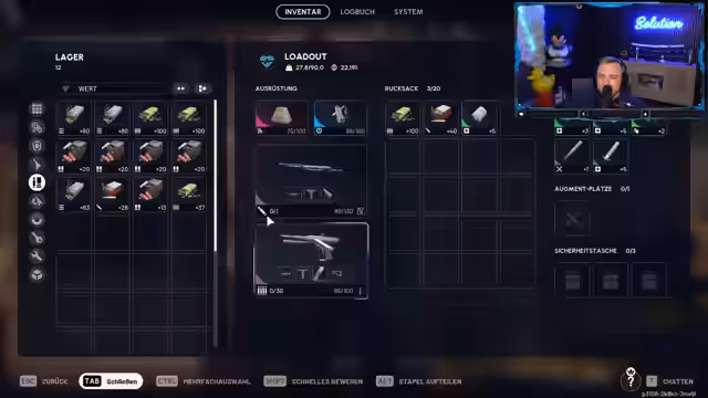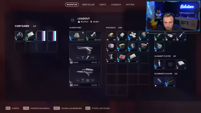 03:05:16Der Streamer ist intensiv damit beschäftigt, sein Inventar zu verwalten und neue Ausrüstung zu sammeln. Er packt große Rucksäcke ein, wie einen lila Backpack und einen dicken Rucksack mit wertvollen Gegenständen. In einer Runde erkundet er strategisch wichtige Orte wie den Kommunikationsturm, Raumhafen und das Laue Tor, um Materialien und Schlüssel zu finden und seine Position im Spiel zu verbessern.
