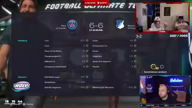 06:33:28Es wird die aktuelle Spielsituation analysiert, wobei der Streamer seinen Unmut über den Spielstand von 5:2 äußert und erwähnt, dass er seinen LTG-Account an die Wand fährt. Er spricht über sein Team und die Kosten bestimmter Spieler, wobei er den neuen Torhüter Nübel hervorhebt. Es wird über die Leistung einzelner Spieler diskutiert, darunter Fonk und Pavel, wobei sowohl positive als auch negative Aspekte angesprochen werden. Der Streamer äußert Frustration über unfaire Spielmechaniken und die Leistung seines Teams, insbesondere in Bezug auf Kopfball-Pingpong und Gegentore. Trotz der Herausforderungen versucht er, die Stimmung aufrechtzuerhalten und die Situation mit Humor zu nehmen. Er erwähnt auch Solidarität mit Willi und äußert den Wunsch nach einem besseren Spielverlauf.