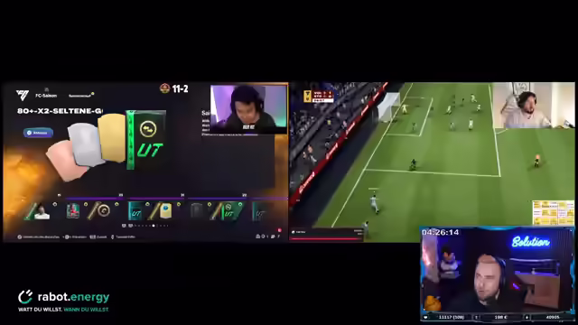 13:17:36Es wird Pannewitz im Endspurt der FIFA-Spiele Mut zugesprochen, die verbleibenden Spiele für sich zu entscheiden und die angestrebten acht Siege zu holen. Gleichzeitig wird die Entscheidung bekräftigt, die bisherigen RTG-Accounts aufzugeben und sich zukünftig auf einen einzigen Pay2Win-Account zu konzentrieren. Der Fokus soll verstärkt auf Watchpartys liegen, da das Spiel selbst oft zu Frustration und negativen Emotionen führt. Es wird betont, dass man sich in solchen Momenten in eine "jaulende Mistfotze" verwandelt und unerträglich wird. Abschließend wird noch erwähnt, dass Casey zum dritten Mal auf einen Hacker getroffen ist, was die ohnehin schon angespannte Situation zusätzlich verschärft.