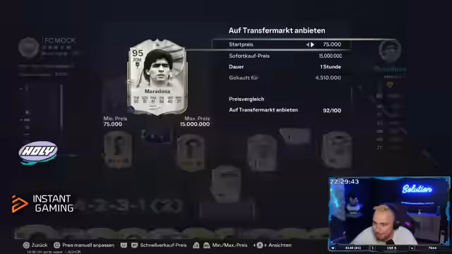 04:50:59Der Fokus verschiebt sich zur Marktanalyse in FIFA Ultimate Team. Der Streamer analysiert die Preisentwicklung von Spielern wie Mbappé, Nico Williams und Pelé und berichtet über Gewinne und Verluste bei Käufen und Verkäufen. Er erwähnt den all-time-low-Preise einiger Karten und den Nachthandel. Parallel dazu wird die intensive Suche nach Spielern für den Cup fortgesetzt, wobei Maldini und Iniesta als unantastbare Wunschkandidaten gelten und das restliche Team als reiner Meta- und Pay-to-Win-Build geplant ist.