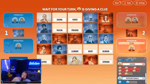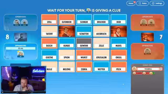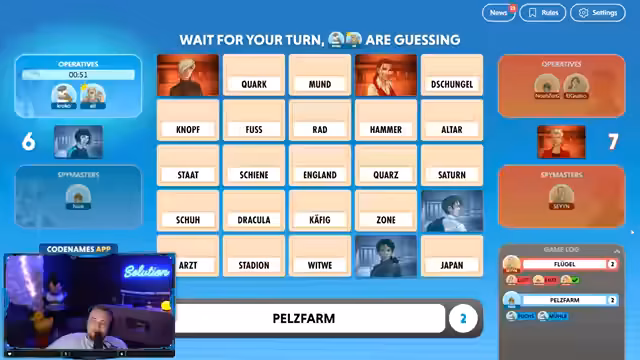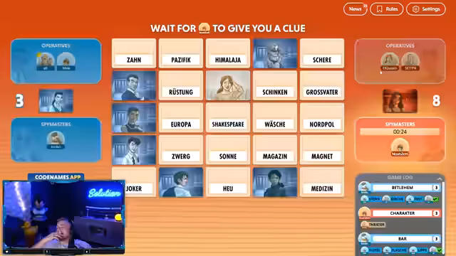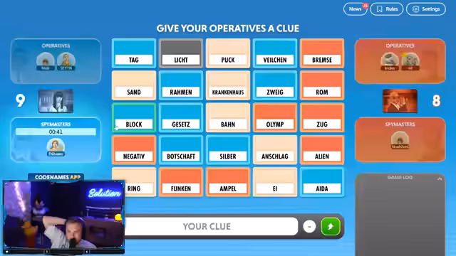 08:41:48Eine neue Runde Codenames beginnt, diesmal mit unterschiedlichen Begriffen. Der Streamer und Noah kommunizieren, indem sie durch die Spielfelder navigieren und versuchen, die richtigen Wörter zu raten. Begriffe wie 'Ärmelkanal' und 'England' werden erörtert, und der Streamer muss die Geografie seines Mitspielers einschätzen. Es kommt zu Verwirrung bei der Interpretation der Begriffe, und Zeitdruck macht die Entscheidungen schwierig. Der Streamer lobt die 'Schwarmintelligenz' des Chats, der bei der Lösung hilft.