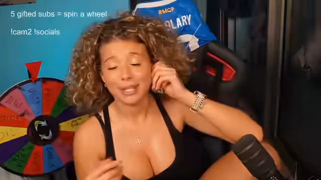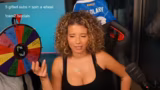 01:02:27Die Streamerin führt die Ankündigung des Streamtitels in die Tat um und veranstaltet ein Spin-the-Wheel-Event. Der Chat soll Ideen für die Inhalte des Rades beisteuern. Nach einer kurzen Pause und einem gescheiterten ersten Versuch, das Rad zu drehen, beschließt sie, das Rad für den nächsten Tag zu behalten. Sie kündigt an, morgen einen regulären Stream zu machen und befragt den Chat darüber, ob sie einen Hot-Tub-Stream durchführen soll, wobei sie champagne darin trinken würde.