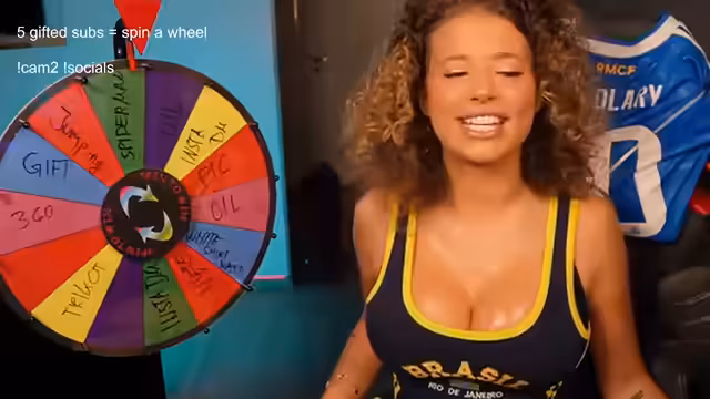 00:09:16Die Möglichkeit eines Spieles wird mit dem Rad inszeniert, bei dem die Streamerin für 25 Euro einen 360-Grad-Dreh vollziehen würde. Die Streamerin interagiert stark mit einzelnen Chat-Mitgliedern, flirtet spielerisch und zeigt sich für Aktionen wie das Tragen eines Yamatrik-Trikots empfänglich. Es werden komplexe, scherzhafte Beziehungen aufgebaut, wie etwa das Verlangen nach einer 'Babymama', was zu einem fiktiven 'Twitch-Baby' führt.