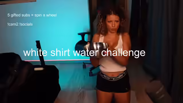 yololaryy startet interaktiv mit dem Chat, spricht über virale Inhalte und TikTok-Sperren. Spin-A-Wheel-Aktionen mit Outfitwechseln und Challenges stehen im Fokus. Es folgen Diskussionen über Rabatte, Pick-Up Lines und eine geplante Yoga-Session. Der Stream endet mit der White Shirt Water Challenge.