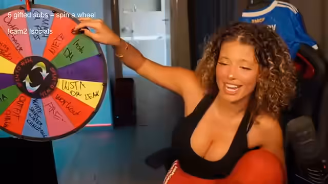 00:09:53Die Streamerin bereitet das Spinner Wheel vor und bittet die Chat-Teilnehmer um Vorschläge für die Aktionen, die darauf stehen sollen. Es werden viele Vorschläge wie 'Flash', 'Workout', 'Bikini anprobieren', 'Oil up' und 'Leak' genannt. Sie stellt klar, dass sie keine sexuellen Inhalte oder Leaks auf dem Rad haben möchte. Der Chat ist sehr aktiv und füllt das Rad mit Ideen.