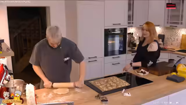 05:17:26Nachdem der Teig fertig geknetet wurde, wird er auf etwa fünf Millimeter Dicke ausgerollt und mit verschiedenen Formen ausgestochen. Die Kekse werden für circa sieben Minuten im Ofen gebacken. Während des Backens stellt die Streamerin fest, dass die Kekse stärker aufgehen als erwartet und eine gewisse Dicke haben. Sie probiert den Teig und stellt einen geringen Zuckergehalt fest, den sie als Vorteil für antientzündliche Kekse ansieht. Nach dem Backen werden die Kekse aus dem Ofen genommen und müssen abkühlen.