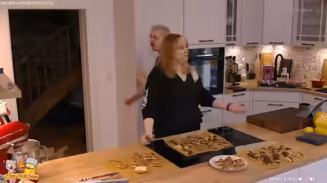 05:22:34Beim Ausrollen des Teigs kommt es zu Diskussionen über die richtige Dicke, da die angestrebten 5 Millimeter schwer einzuhalten sind. Es wird scherzhaft ein Lineal zurate gezogen, um die Dicke zu überprüfen. Während des Ausstechens der Kekse wird die Vorfreude auf das gemeinsame Backen mit Belle in zwei Wochen geäußert, wo alle Formen genutzt und die Kekse „richtig ordentlich und schön gemacht“ werden sollen. Die ersten Kekse werden gebacken, wobei die Backzeit auf etwa sieben Minuten geschätzt wird. Es wird festgestellt, dass der Teig durch das mehrmalige Ausrollen immer trockener wird, was die Qualität der Kekse beeinträchtigen könnte. Die ersten gebackenen Kekse sind überraschend dick und fluffig, fast wie 3D-Kekse, was auf eine zu hohe Menge Weinsteinpulver oder eine zu hohe Ofentemperatur hindeutet.