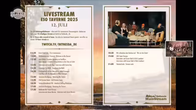 00:04:33Der Vormittag wird von Interviews mit Entwicklern und Community-Managern geprägt. Gegen 13 Uhr ist Carrie Dale, Systemdesignerin von ESO, zu Gast. Später findet der Cosplay-Catwalk statt, bei dem die detailverliebten Kostüme vorgestellt werden. Ein weiteres Highlight ist der Prüfungslauf mit der Gilde Asnikandi. Am Nachmittag werden verschiedene ESO-Streamer das Spiel 'Was bin ich?' präsentieren. Ein besonderes Interview führt Kathi mit Community-Goldschmieden über das Schmuckhandwerk.
