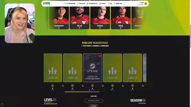 04:45:19Während des Streams wird eine Partnerschaft mit LVM für den nächsten Season Pass vorgestellt und erklärt. Ein grüner Mann namens Larry kommt stündlich ins Bild, um einen Code preiszugeben, den die Zuschauer in einem Portal einlösen können. Durch das Sammeln dieser Codes können die Teilnehmer XP sammeln und an Verlosungen teilnehmen, bei denen unter anderem Controller, Steam-Guthaben, Gaming-Stühle und schließlich ein Gaming-PC gewonnen werden können. Die Streamerin betont, dass es sich um eine entspannte Langzeitaktion über drei Monate handelt und viele bekannte Streamer teilnehmen. Sie weist darauf hin, dass dies eine neutrale Partnerschaft sei und es keinen Druck zur Teilnahme gäbe.