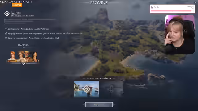 01:03:00Nachdem alle ankündigten und Gespräche geführt wurden, beginnt die Streamerin mit dem eigentlichen Hauptinhalt des Streams: dem Spielen von Anno 1800. Sie beginnt einen neuen Spielstand im Endlos-Modus auf Normal-Schwierigkeit. Im Chat wird über die Wahl des Startcharakters diskutiert, bevor sich die Streamerin für den Charakter 'Dorsch' entscheidet. Die beschriebene Spielwelt ist das Latium, einst das Herz des Reiches, das nun neu aufgebaut werden soll. Es wird mit dem Bau der ersten Gebäude begonnen.