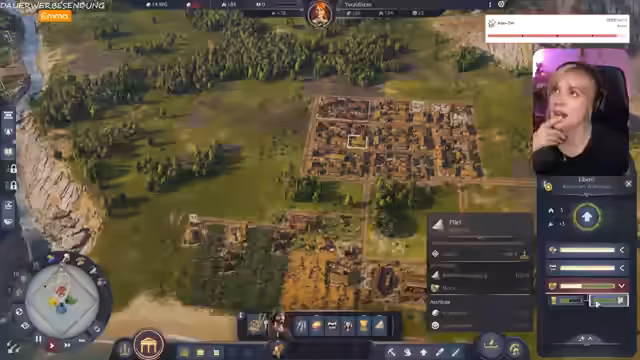 01:14:47Die Streamerin interagiert intensiv mit dem Chat, der über Anno-Erfahrungen und persönliche Geschichten berichtet. Eine Zuschauerin namens Anne, die das Spiel seit jeher spielt, erwähnt. Parallel dazu werden in Spiel erste Herausforderungen deutlich: Es kommt zu einem Mangel an Arbeitskräften und die Produktion von Ziegeln stockt, was den weiteren Ausbau und das Erreichen der nächsten Bevölkerungsstufe verzögert. Der Chat gibt Tipps zur Problemlösung.