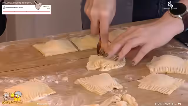 05:54:18Der Streamer beschreibt den Prozess des Maultaschenmachens im Detail. Es wird davon gesprochen, wie die Teigportionen mit einer Nudelrolle flachgedrückt und anschließend mit der selbstgemachten Füllung befüllt werden. Dabei wird auf Schwierigkeiten wie Kleben an der Arbeitsfläche und die Notwendigkeit, die Maultaschen nicht zu dicht zu platzieren, um ein Zusammenbacken zu verhindern, eingegangen. Die Maultaschen werden anschließend vorsichtig in kochende Gemüsebrühe gegeben, um zu garen.