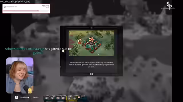 03:49:46Es wird eine Integration von Twitch in das Spiel erwähnt, bei der die Zuschauer abstimmen können. Der Streamer stellt fest, dass dies funktioniert und findet es cool, dass der Kult mitentscheiden darf. Parallel dazu startet ein Hype-Train im Stream. Nachdem das Sub-Ziel von 50 Abos erreicht ist, wird ein neues, höheres Ziel von 1600 Abos angekündigt. Der Streamer verkauft Anne für dieses Ziel, indem er verspricht, dass sie 'Yoshi's Island' spielen muss, was sie zunächst nicht kennt und daher unterschätzt.