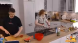 00:47:29Nachdem der Blumenkohl im Ofen ist, wird die Sosse für den Salat zubereitet. Dafür wird Joghurt, Mayonnaise und Essiggurkenwasser vermischt. Währenddessen findet eine humorvolle und lebhafte Diskussion über die verschiedenen Tricks, um den Inhalt von Gläsern zu entleeren, statt. Dabei werden Methoden wie das Umstülpen und Schlagen, das Durchstechen des Deckels oder den Einsatz eines Flaschenöffners diskutiert und kritisch beleuchtet. Parallel dazu wird das geschnippelte Gemüse für die Sosse fertiggestellt.