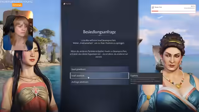 00:21:41Geplant war ein gemeinsamer Koop-Stream des Spiels 'Anno' mit dem Streamer Ranger. Doch direkt beim Start des Mehrspielermodus treten massive technische Schwierigkeiten auf. Die Verbindung zu den Ubisoft-Diensten ist mehrmals unterbrochen, was das gemeinsame Spielen unmöglich macht. Nach zahlreichen Versuchen und Fehlern, die sowohl bei der Einladung als auch beim Beitreten zum Spiel auftreten, wird der Joint-Stream vorzeitig abgebrochen. Die Streamerin gibt zu, dass sie durch den Ausfall deplatziert und gestresst wirkt und sich auf den Spielplan konzentrieren muss.