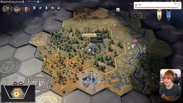 05:39:25Im weiteren Verlauf der Runde gerät der Streamer in ein taktisches Dilemma, nachdem die Bevölkerung einer Nachbarstadt unzufrieden ist und sich anschließen möchte. Er muss entscheiden, ob er den Einfluss in diese Stadt investiert, um sie einzugemeinden oder ob er seine Ressourcen lieber für den Ausbau seiner eigenen Städte verwendet. Gleichzeitig versucht er, diplomatische Beziehungen zu anderen Zivilisationen zu pflegen, um sich für den Fall eines Krieges zu rüsten. Er beginnt mit dem Bau von Weltwundern wie den 'Hängenden Gärten', um Bonuspunkte zu erhalten und seine Kultur zu stärken.