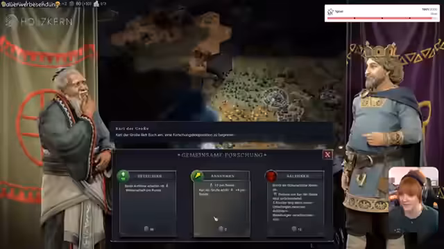 06:14:34Der Streamer navigiert durch diplomatische Entscheidungen und Quests, wobei er sich für ehrliche Beziehungen statt Ausbeutusysteme entscheidet. Es kommt zu Krisen, wie einer "Aufruf zum Krieg", die er jedoch zu umgehen versucht, da er sich auf die innere Entwicklung konzentriert. Die Strategie zielt darauf ab, die Zufriedenheit der Bevölkerung hochzuhalten und das Reich friedlich zu erweitern, um nicht in militärische Konflikte verwickelt zu werden.