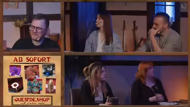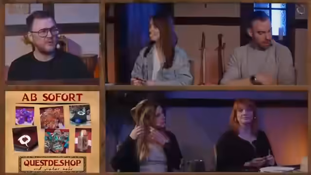 01:00:34Zurück in der Gilde haben sich die Vorbereitungen für die Gala nun vollends gefestigt. Vera hängt eine Dart-Scheibe an die Wand, die von einem Besucher geschenkt wurde. Alena, nun im Koch-Outfit, steht bereit, um die Gäste zu bewirten. Die Stimmung ist gelöst und fast schon ausgelassen. Die Jungs der Gilde, begleitet von dem Konstrukt Jasper, genießen den Abend in geselliger Runde und erwarten den offiziellen Start des Events mit den geladenen Gästen aus ganz Großwall.