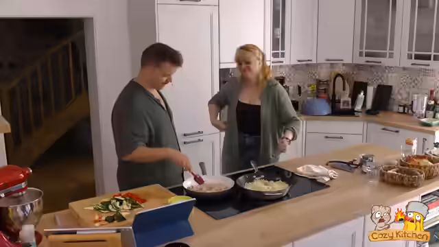 07:27:03Parallel dazu wird das Curry in einer separaten Pfanne zubereitet. Zuerst werden Zwiebeln, Knoblauch und Ingwer in heißem Öl angeschwetzt, bis sie duften. Anschließend kommen die Garnelen für zwei bis drei Minuten pro Seite hinzu. Daraufhin werden Paprika und Zucchini hinzugefügt und kurz angebraten, um ihre Knackigkeit zu erhalten. Zum Schluss wird Currypaste mitgeröstet und mit Kokosmilch aufgegossen.