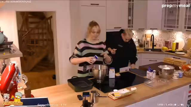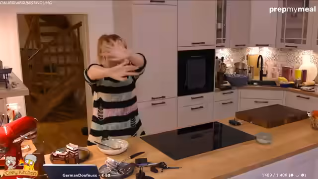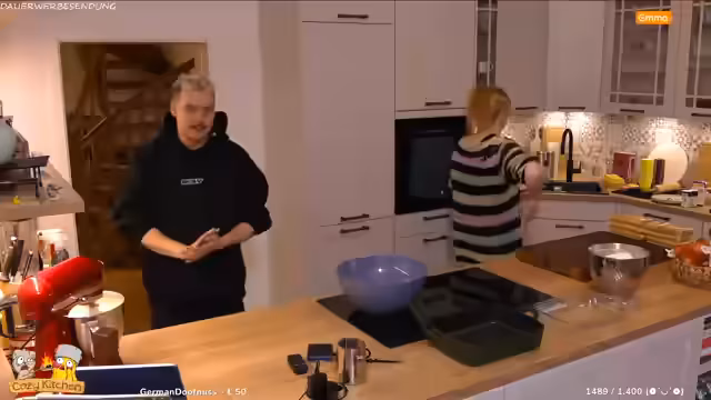 03:53:57Nach dem Malstream kündigt der Streamer einen Wechsel in den Küchenbereich an. Er plant, Tiramisu zuzubereiten und bittet um die Anwesenheit von Marco. Während der Vorbereitungen werden kurz technische Einstellungen angepasst und der Raum wird für die Kochaktivität umgestaltet. Dabei kommt es zu einer humorvollen Diskussion über einen Messerblock, der aus dem Sichtfeld entfernt wird.