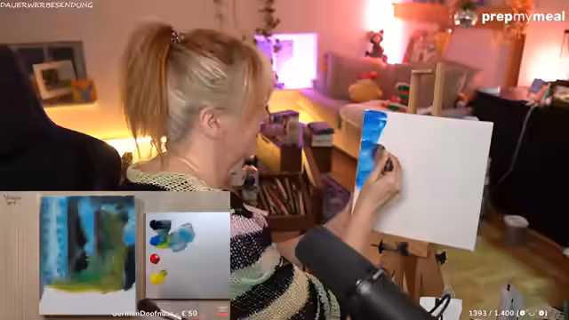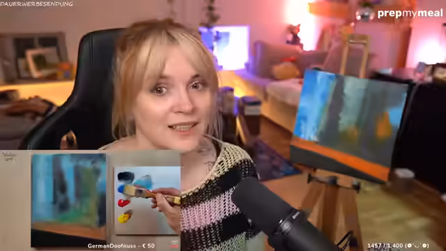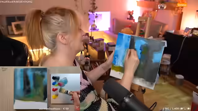 00:46:09Nach der Buchdiskussion beginnt die kreative Phase: Gemeinsam mit dem Chat wird ein Bild nach Bob-Ross-Prinzip gemalt ('Bob Raldes'). Eine Videoanleitung ist auf YouTube angepinnt. Der Streamer bereitet Farben (Schwarz, Blau, Gelb, Weiß) und Pinsel vor, erklärt die grobe Arbeitsweise und ermutigt zur Mitnahme von Malutensilien. Die Ergebnisse sollen später auf Discord geteilt werden. Die Malaktion wird als entspannendes Gemeinschaftsprojekt beschrieben.