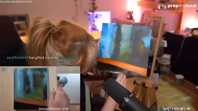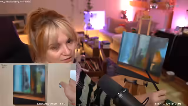 01:45:14Nach der Trocknungsphase geht der Stream mit weiteren Farbschichten weiter: Es werden Schatten mit Blau-Schwarz-Mischung hinzugefügt, um Tiefe im Bild (ein Fenster mit Kerze) zu erzeugen. Parallel dazu entsteht eine Diskussion über Pen & Paper-Rollenspiele – der Streamer lobt die Vielfalt der Twitch-Community und ermutigt talentierte Zuschauer, ihre Kunstwerke zu teilen. Er erwähnt eigene Kampagnen in D&D und die Freude an gemeinsamen kreativen Projekten. Ein Höhepunkt ist der Vorschlag, ein Bild als Dank für 1.000 Abos zu versteigern.