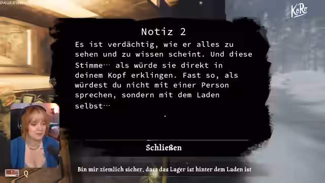 03:00:38Der Stream beginnt mit einer düsteren, unheimlichen Atmosphäre. Eine Figur berichtet von Schritten im Dunkeln und äußert ihre Angst vor einem Eindringling, der es auf ihr Geld abgesehen haben könnte. Die Monologe deutet auf eine isolierte und gefährliche Situation hin, die den Rahmen für eine Horror-Simulation zu sein scheint. Gleichzeitig wird der Alltag in einem scheinbar normalen Laden beschrieben, der als Zuflucht und Sicherheit dient, was einen starken Kontrast zur bedrohlichen Umgebung schafft und die verwirrende, surreale Natur des Ortes unterstreicht.