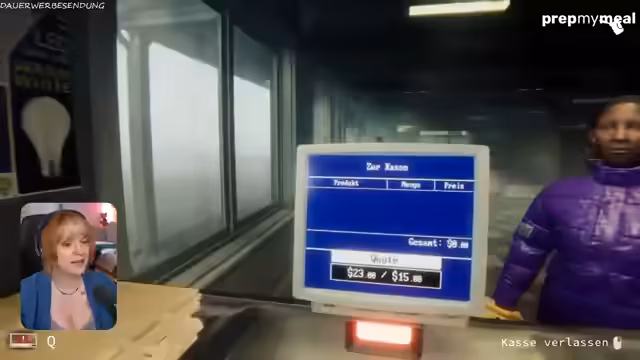 00:13:27Nach den einleitenden Worten und einer Erwähnung eines gestrigen Brettspielabends startet der Stream in Hellmart. Zunächst werden die Anfangsaufgaben gezeigt: Putzen und das Anordnen der Waren in den Regalen. Der Streamer äußert seine Freude über die ungewöhnliche Kombination aus Simulation und Horror und geht ins Detail bei der Bedienung der Kasse und der Umgangsformen mit den Kunden, wie dem korrekten Herausgeben von Wechselgeld.