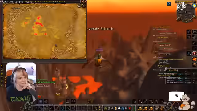 00:25:50Der Streamer spielt World of Warcraft im Hardcore-Modus mit der Community. Als Neuling ist sie Level 19 und strebt Level 20 an, um wichtige Skills freizuschalten. Sie erklärt Quests in Gebieten wie Dunkelküste, interagiert mit anderen Spielern und kommuniziert strategisch im Chat. Sie lobt WoW als Ideal für die Prüfungsphase, da es nebenbei laufen kann. Später diskutiert sie mit einem anderen Spieler ('Ranger') über Erreichbarkeit und den Schwierigkeitsgrad für neue Streamer gegenüber etablierten Accounts.