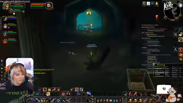 01:48:17Die Gruppe sucht einen weiteren DD (Damage Dealer). Maya (Paladin, Level ~20) wird als Kandidat genannt. Der Streamer klärt, dass Questing im Raid nicht möglich ist, und empfiehlt Todesminen für Quests. Es wird diskutiert, ob HDW schwieriger ist als Deadmines, wobei HDW als etwas höher stufig eingeschätzt wird.