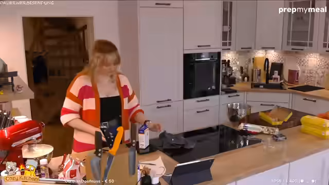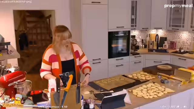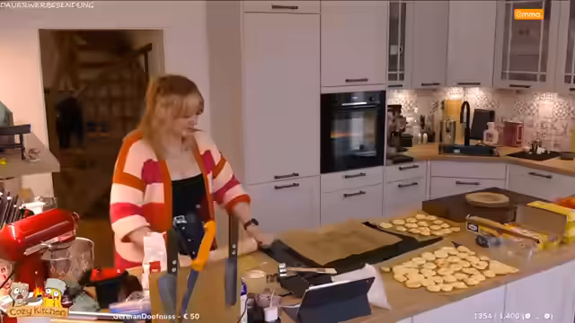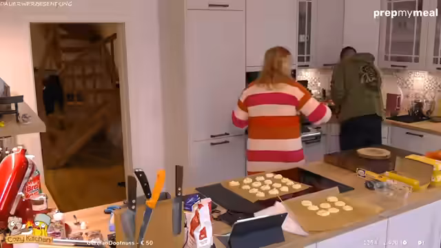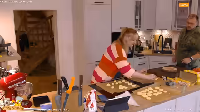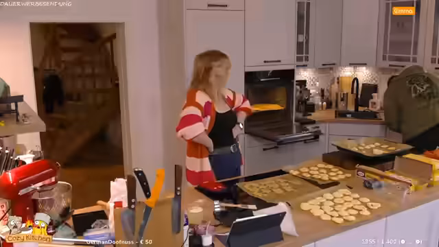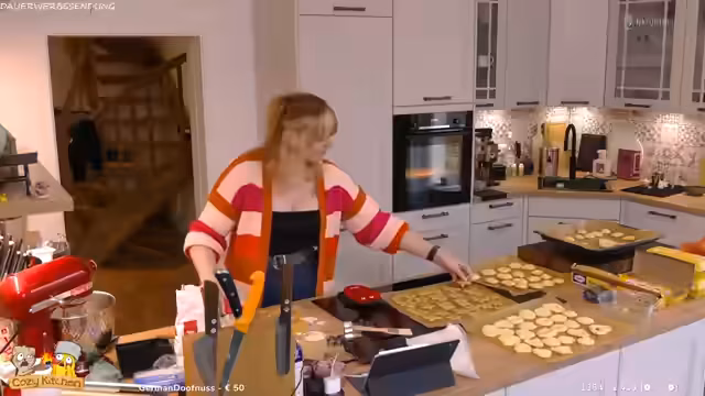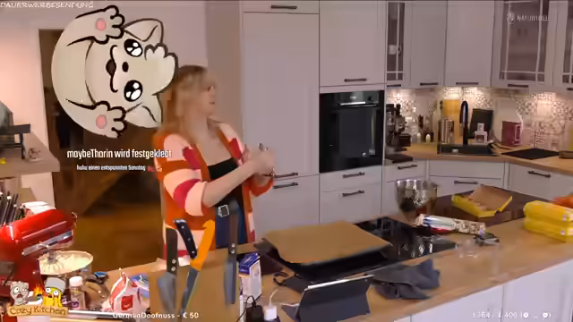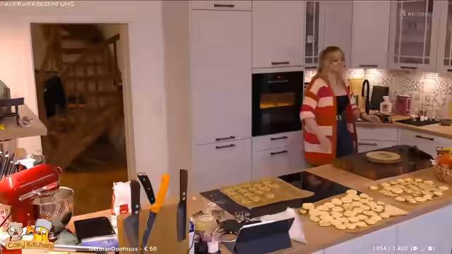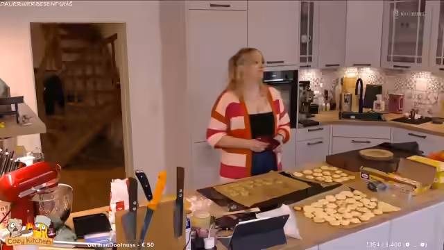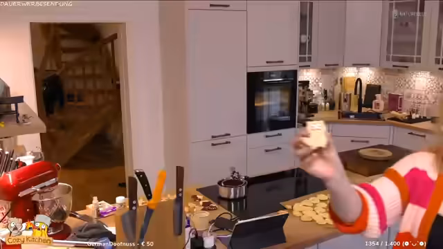 05:26:00Die Küchenumgebung wird detailliert beschrieben: Sie hat einen gemütlichen Landhausstil mit viel Platz und integriertem Esstisch, was den Streamer an seine Berliner Zeit erinnert. Es werden Backaktivitäten vorbereitet, darunter spezielle antientzündliche Plätzchen. Ein Partner aus der Küche (Backpapierzuschnitt) wird identifiziert, während ein weiterer Partner nicht offensichtlich ist. Der Streamer erwähnt Waren aus dem Shop wie Umweltdruckerei-Drucke und Plüschtiere aus Polen, die nachhaltig produziert werden.