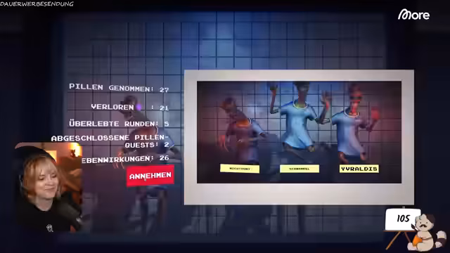04:04:22Das Spiel zentriert sich um das Sammeln von Tabletten, von denen einige vergiftet sind. Streamer müssen auswählen, welche Tablette sie nehmen, mit dem Ziel, die vergifteten zu meiden und Heilung oder positive Effekte zu erhalten. Die eigene Rüstung und Lebenspunkte werden durch Tabletten-Einnahme beeinflusst, wobei einige zur Heilung und andere zum Tod führen. Die Situation wird komplexer durch den Einsatz von Items wie dem Mundspreizer, der es einem Spieler ermöglicht, einen anderen zu füttern, und dem Duplikator, der Effekte kopiert.